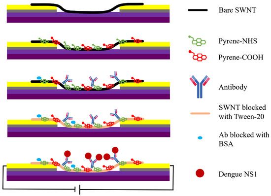 Figure 1 shows a schematic of the functionalization of the SWNT networks with anti-NS1 antibody. In brief, the chips were placed in a chamber with humidity controlled by petri dish containing DI water. The SWNT networks are first incubated for 1 h with a mixture of 1-Pyrenebutyric acid (Sigma Aldrich, St. Louis, MO, USA) and 1-Pyrenebutyric acid N-hydroxysuccinimide ester (PBASE) (Sigma Aldrich, St. Louis, MO, USA) at a 3:1 molar ratio into 1 mL of dimethylformamide (DMF). This resulted in the pyrene moieties non-covalently attaching to the SWNT by π-π stacking while exposing the N-hydroxysuccinimide ester for covalent attachment with anti-NS1 antibody with an amide bond [34,35]. Chips were washed with DMF, followed by drying with N2 gas. Each of the following incubation steps were in the dark at 4 °C with similarly controlled humidity. The entire surface of the chip was covered by 2 mM 6-mercaptohexanol in DMF for 30 min followed by washing with DMF. Next, a 10 μL drop of buffer-exchanged antibody was pipetted onto the sensing region and incubated for 2 h, creating five independent immunosensors on a single chip. Finally, in order to block non-specific interactions with the SWNT or antibodies, the immunosensor was incubated with 0.1% Tween 20 in DI (BIO-RAD) for 1 h, gently washed with PB, and then 1% bovine serum albumin (BSA) for 1 h followed by gentle washing with PB.