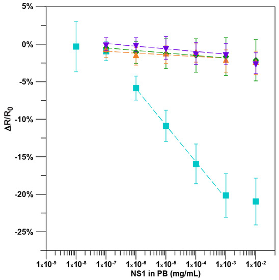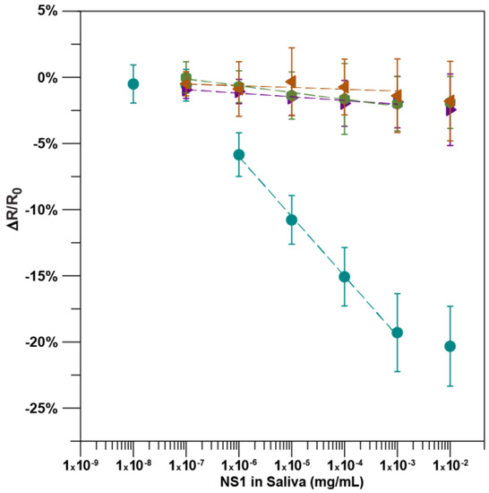 Measurements were performed in the dark with high humidity. The resistance of the five immunosensors per chip was individually measured at a fixed source-drain potential (VDS) of 0.1 V by a Keithley 2636 SourceMeter (Tektronix, Beaverton, OR, USA). As a control, two incubations with unadulterated PB or artificial saliva performed prior to sample analysis, immunosensors with ≥ ±5% change in normalized resistance were excluded. During incubation, the sensing region was covered by 10 μL of sample solution for 10 min. The sample solution consisted of unadulterated PB, unadulterated artificial saliva, PB adulterated with NS1 or BSA, or artificial saliva adulterated with NS1 or BSA. Unadulterated samples were used for blanks and control measurements, and adulterated samples were used for detection and control measurements. The incubation of a sample solution was immediately followed by gentle washing and a 20 μL drop of PB to cover the sensing region. To detect the newly bound analyte from sample incubation, the resistance was permitted to stabilize under the 20 μL drop of PB and a resistance measurement was taken. Sample concentration started at the lowest concentration and was increased step-wise with 10-fold increments. All measurements were made at room temperature (~22 °C). Following the highest NS1 concentration, another incubation and measurement using the blank solution was performed. The normalized resistance change of each immunosensor (Equation (1)), was calculated using the equation