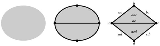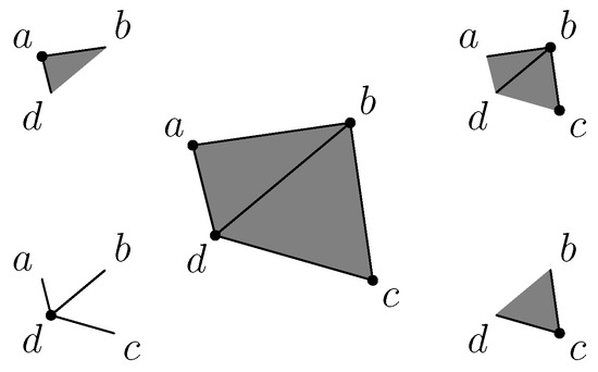 By definition [17], an abstract simplicial complex consists of a finite set V of vertices and a family of subsets of V, called simplexes. The collection should satisfy the closure constraint by subset. That is, if the is an element of the family , then a sub-simplex is also an element of . A sub-simplex of a simplex is called a face of . Thus, the closure constraint means that all faces of a simplex are also simplexes.