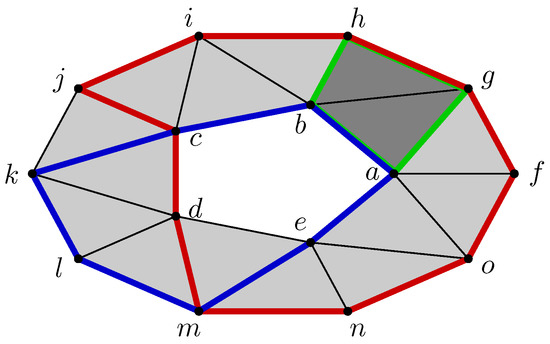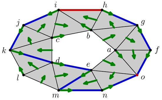 It remains to link these two cells and by the boundary operator. For fulfilling this task, it suffices to follow the flow starting from the boundary of , which are the vertices h and i. As and as well, the boundary of the cell is , which is counted twice as shown in Figure 6.