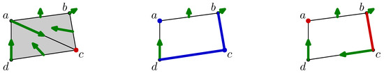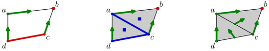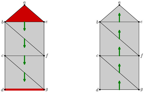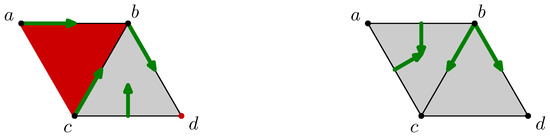 Consider a few examples in order to understand the behavior of this flow operator. Consider, once again, the discrete vector field on the left side of Figure 4. Here, . Actually, the vertex a seems to move to b according to the discrete vector field. The next example illustrates the cumulative effects between the part of the flow passing through the dimension, i.e., and the one passing through the dimension, i.e., . The simplex moves to . Intuitively, the edge moves to and , but, as the vertex c also moves to b, the edge is not taken into account, and there is a simultaneous displacement of the edge and of a vertex of this edge.