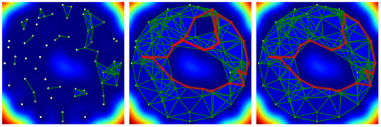 At the beginning of the simulation, in the left part of the figure, the simplicial complex holds only a few edges because the estimation of correlations is still too poor to identify viable edges. After a certain delay, as shown in the center of the figure, the simplicial complex approaches the coverage in a satisfactory way. Thanks to the discrete vector field, two holes are detected and localized by the two generators of the homology group , which are visualized by red paths in Figure 10.