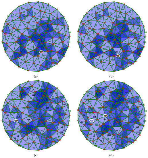 Sometimes, the magnitude of the modification is important because the solution requires the activation of several sensors. For example, between states of Figure 11c,d, the extinction of the node 123, circled on the left, should be balanced by the activation of nodes 95 and 108. However, the activation of the latter node is redundant with the node 115, which is now put into sleeping mode. In this case, four nodes are involved in the correction of the coverage, unlike most cases where the activation of a single neighbor node is sufficient.