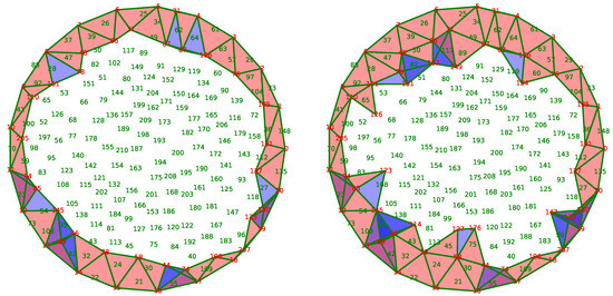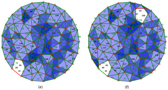 Figure 12 shows one iteration of this algorithm in which the active nodes are in red, while the others are in green. The 2-chain in construction is in pink, and blue triangles indicate the triangles with three active edges but not in . The subfigure on the left represents the chain at the beginning and the one on the right represents the same chain at the end of the step. Intuitively, we can see that the algorithm constructs gradually a coverage hanging on the boundary F and following the direction of the vector field V to cover the whole space X.