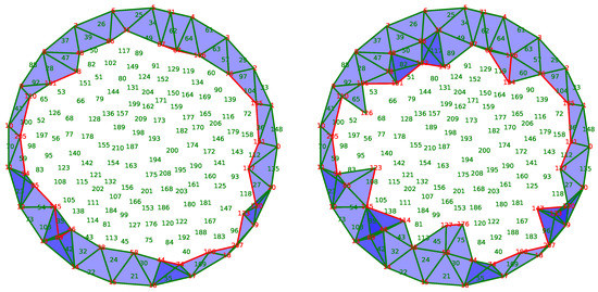 In the first method, depending on the vector field, a triangle may be added in the chain during an iteration and be removed later because it is visited twice by the flow and because, in the binary field, . However, with the same setting in the second method, the vertices of this triangle added to the list of activated nodes in line 5 cannot be removed afterward. Consequently, all vertices activated with the first method are also activated with the second method, but the vertices of triangles visited twice are also present with the second method.