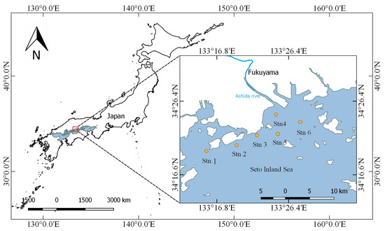 The study area is in the central part of the Seto Inland Sea near the city of Fukuyama as shown in Figure 1. We selected six sites as sampling stations, which are described in Table 1. The study area has an average water depth of 17.3 m and water temperatures range from 7.3 °C (winter) to 28.4 °C (summer). The Seto Inland Sea is rich in fishery resources, with more than 50% of the total fish production contributed by aquaculture production. Additionally, there are approximately 17 fish farms being operated in the Tashima and Yokota areas near our study area [26]. Consequently, there are a range of organic compounds released by fish farm waste that may affect eutrophication due to dissolved nitrogen [27].