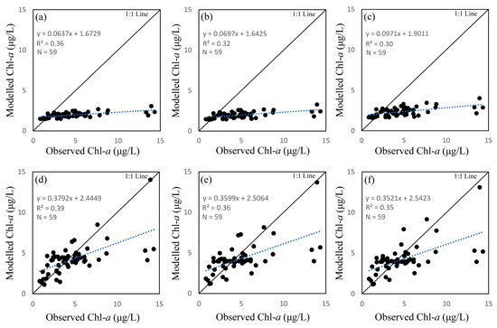 Correlation between observed and modelled chlorophyll a (Chl-a) using ocean chlorophyll (OC) algorithms. The first row shows results using standard coefficients (a) OC2; (b) OC3; and (c) OC4. The second row shows results from recalibrated OC models using the dataset of this study (d) OC2; (e) OC3; and (f) (OC4).