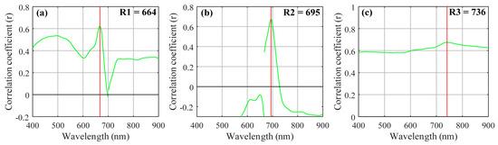 Selected wavebands for the three-band model algorithm using the tuning method (a) optimal band λ1; (b) optimal band λ2; and (c) optimal band λ3.
