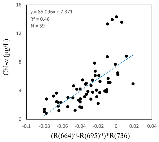 The three-band and two-band algorithms were both based on the NIR region, which has high absorption by water, and the red region, which has high absorption by Chl-a. Figure 3 shows the three-band algorithm tuning process. The optimal λ1 appeared at 664 nm where the r value is highest when using assumed λ2 and λ3 values of 700 nm and 750 nm, respectively. λ2 and λ3 appeared at 695 nm and 736 nm when using the tuning method. These results showed a linear relationship between the three-band algorithm and Chl-a concentration with a R2 value of 0.46, as shown in Figure 4.