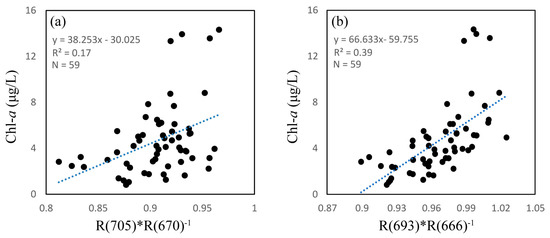 Relationship between observed chlorophyll a (Chl-a) concentration and near-infrared/red reflectance ratio, (a) Ratio of R(705) to R(670); (b) Ratio of R(693) to R(666).