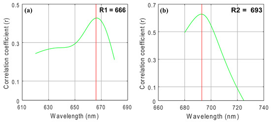 Selected wavebands for near-infrared/red algorithm using the tuning method (a) optimal band λ1; (b) optimal band λ2.