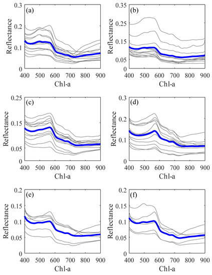 Remote sensing methods for retrieving water quality parameters contain spatial and temporal variations because the water body components that affect reflection properties vary in space and time. To further clarify the most fitted Chl-a retrieval method in the research area, we analysed algorithms using a separated dataset of six stations. Figure 7 shows the RL and average RL of each station for the research period. As we can see, the average RL of each station shows little difference those of the others. Especially at station 4 (Figure 7d), there is an obvious reflectance peak around 580 nm, which is a result of minimum absorption by all pigments [42]. Figure 1 shows that station 4 is near a river, which could bring various nutrients from land to the coastal area. Consequently, the highest max Chl-a and SD values were obtained at station 4, as shown in Table 2.
