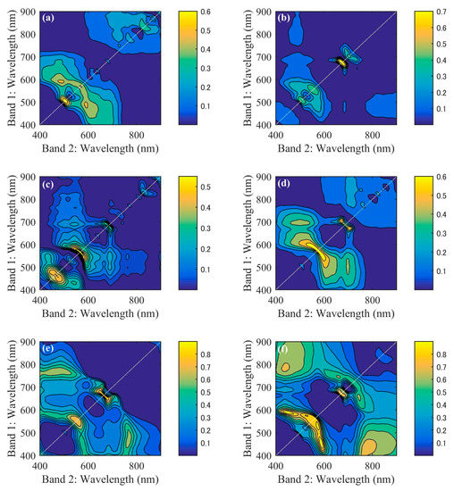 Two-dimensional R2 distributions obtained through sequential regressions using all band ratios and chlorophyll a (Chl-a) concentrations for each station ((a–f) are stations 1 to 6 in turn).