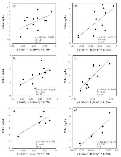 Calibrations between the three-band model algorithm and chlorophyll a (Chl-a) concentrations ((a–f) are stations 1 to 6 in turn).