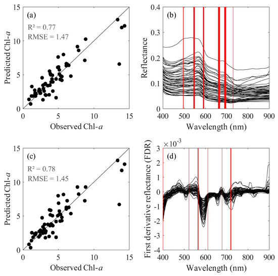 Because of the iterative stepwise elimination function, we selected the optimal wavebands using ISE-PLS for both RL and FDR datasets based on the lowest RMSE for validation, as shown in Figure 11b,d. Selected wavebands for RL ranged from 495 to 496 nm [43], 589 to 593 nm [44], and 660 to 667 nm [45], which had been proven related to phytoplankton absorption, 544 to 549 nm [43], and 689 to 696 nm [32], which indicated relationship with Chl-a fluorescence, and 730 nm which is also sometimes used for Chl-a retrieval [45]. We selected a total of 30 (6%) informative wavebands from all 501 wavebands. And for FDR, we selected 10 (2%) informative wavebands from all 501 wavebands.