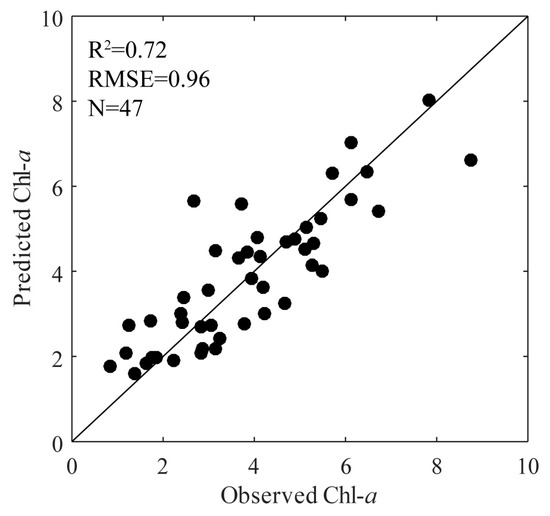 In this study, station 4 may have been affected by river nutrients, we carried out ISE-PLS regressions using the RL dataset except for at station 4 to decrease the impact of different water types. Figure 12 shows the validation plot between observed and predicted Chl-a, which was obtained using the LOO method in the ISE-PLS regression. As we can see, the maximum Chl-a concentration (from 14.33 to 8.74 μg/L) decreased after removing the station 4 dataset. Results shows a close linear relationship between observed and predicted Chl-a; however, compared to the R2 value (0.77) obtained by ISE-PLS validation using all datasets (N = 59), a relatively lower R2 value (0.72) was obtained using the datasets except station 4 (N = 47), which may indicate that ISE-PLS performed better in water areas with a wide range of Chl-a concentrations.