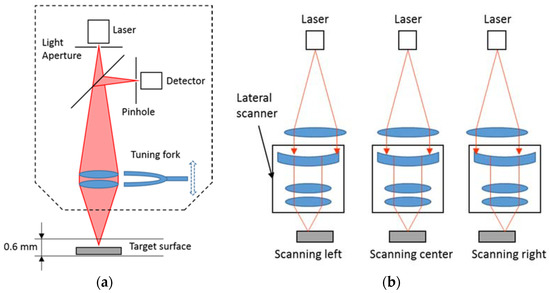 Working principle of the laser confocal sensor. (a) Vertical scanning mechanism; (b) Lateral scanning mechanism.