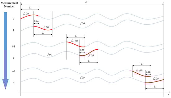 Due to the misalignment between the LCS scanning axis and linear stage movement axis, jump errors were observed at the overlapping surface profile. To reduce this misalignment error, a data stitching algorithm was introduced, which was based on the iterative least-square method. Figure 4 shows the model of n-times of surface profile data stitching, where f(x) and D represent the entire profile to be measured and its length, fi(x) and L represent part of the whole profile to be measured and its length in each measurement, 0.2 L represents a 20 percent overlapping length between two adjacent surface profiles. Several publications [33,34,35] report that a 20 percent overlapping surface will give a good trade-off between having good stitching accuracy and obtaining large measurement range with minimum data sets.