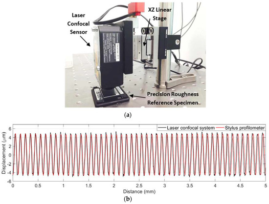 With the integration of the XZ-configured linear stage and data stitching algorithm, the proposed system could achieve a surface profile measurement up to 12.7 mm in length. The laboratory set-up of the proposed system and the precision roughness reference specimen are shown in Figure 5a. To verify the extended data stitching algorithm, the precision roughness reference specimen was measured using the proposed laser confocal system and the Talysurf PGI 800 stylus profilometer (AMETEK Inc., Berwyn, PA, USA) separately. The measured surface profiles are plotted in Figure 5b. As can be seen from this figure, a good match between the laser confocal profile and the stylus profile was observed.