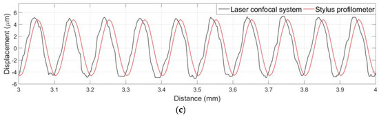 To compare the discrepancies between the two profiles in Figure 5b, the enlarged partial surface profiles are plotted in Figure 5c. It can be observed that the laser confocal profile has higher peak-to-valley amplitudes compared to that from the stylus profile. It also indicates noise-like spikes at the profile peaks and valleys. In addition, the laser confocal profile is not as symmetric as that from the stylus profile, which is mainly attributed to the light scattering effect at the steep slope section in the surface profile. These observations are consistent with the results from previous studies [11,39,40], which showed that the area of high curvature at surface peaks and valleys may produce severe measurement distortions and noises.