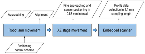 The proposed system is also integrated with a 3-stage motion control to minimize vibration caused by the positioning system or scanning mechanism. For in-situ measurement, the motion system, which could be a robot or other motion stages, may cause notable vibration. Lateral scanning is also another source of vibration, which is an important consideration for conventional off-line measurement systems. In this research work, in order to minimize the vibration, the proposed system only actuates the embedded scanning mechanism simultaneously with data collection. The robot arm is used only for approaching and alignment operations, roughly adjusting the measuring distance and angle.