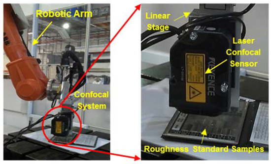 The characterization of surface topographic features on a component is typically quantified using two-dimensional roughness descriptors which are captured by off-line desktop instruments. Ideally any measurement system should be integrated into the manufacturing process to provide in-situ measurement and real-time feedback. A non-contact in-situ surface topography measuring system is proposed in this paper. The proposed system utilizes a laser confocal sensor in both lateral and vertical scanning modes to measure the height of the target features. The roughness parameters are calculated in the developed data processing software according to ISO 4287. To reduce the inherent disadvantage of confocal microscopy, e.g., scattering noise at steep angles and background noise from specular reflection from the optical elements, the developed system has been calibrated and a linear correction factor has been applied in this study. A particular challenge identified for this work is the in-situ measurement of features generated by a robotized surface finishing system. The proposed system was integrated onto a robotic arm with the measuring distance and angle adjusted during measurement based on a CAD model of the component in question. Experimental data confirms the capability of this system to measure the surface roughness within the Ra range of 0.2–7 μm (bandwidth λc/λs of 300), with a relative accuracy of 5%.