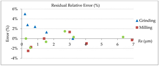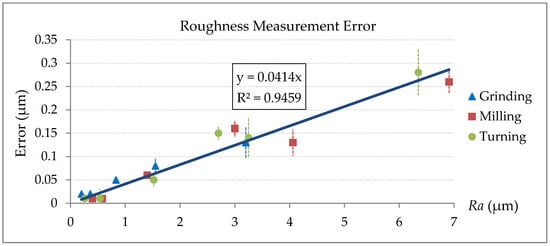 In Figure 9, unique markers represent the different data of grinding, milling and turning for reference. Unfortunately, in practical measurement, machining patterns and Key Performance Indicators (KPIs) are sometimes unknown. In this study, therefore, a combined linear function was provided for error correction.