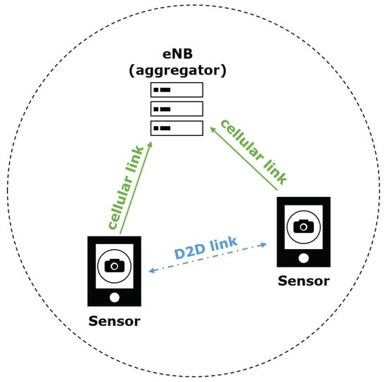 Many problems are considered that can occur in WMSN such as deployment costs, energy-efficient routing, network coverage, and connectivity [15,16,17]. One of the fundamental deficiencies that cause these problems is a centralized structure. All generated data were finally sent to a central aggregator (CA) in previous studies. Unlike the typical WSN system, the amount of traffic is very large in WMSN. It is a significant burden for the CA, and it can degrade the overall performances of WMSN. Thus, device-to-device ( D2D) communication should be considered in WMSN. The D2D communication in WMSN can be used for various services such as live streaming services and mobile aggregating systems. For the case of the streaming service, local streaming broadcast to personal devices in a stadium can be considered. The data can be broadcast to local networks. To reduce the dense overhead to the central system, the traffic should be distributed as much as possible. In the services, D2D links of WMSN can be considered. Additionally, mobile aggregating is one of the candidates to use D2D links for WMSN, which means that sensor networks use a mobile device as an aggregator [18,19]. To support the mobile aggregator, multi-hop communication should be considered, where a D2D link is adopted.