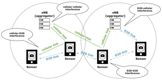 In the sensor deployed systems considered, the cellular channel is divided into cellular and D2D links. A sensor can be connected to an aggregator via a cellular link or connected to another sensor via a D2D link. Because of these links, there are four interference cases as shown in Figure 2. The first two cases are the interference between cellular links and between D2D links. This interference can occur in both intra-cell interference and inter-cell interference in the case that the same frequency is allocated to the same type of link. Another case is the interference between cellular and D2D link. The process for sensors to control the complex interference situation is a challenging issue. The proposed solution in this paper focuses on minimizing interference while maximizing throughput by allocating the given radio frequency intelligently to each link.