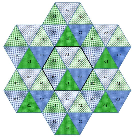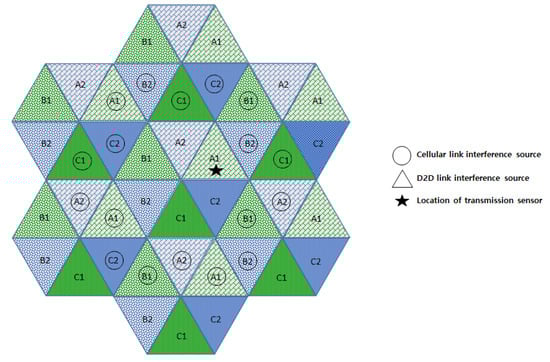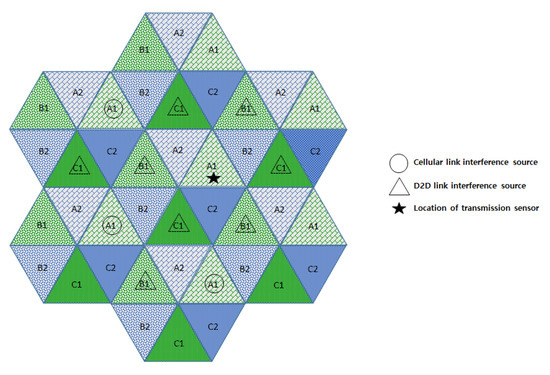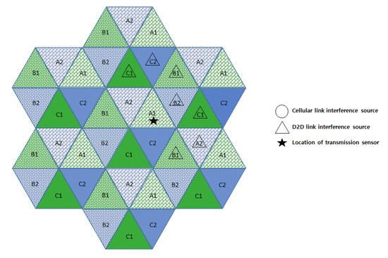 where is the distance between the point and the zone, and q means types of neighboring zones, . S is the area of a zone, and is the distance between from a sensor to the eNB. The figures in Table 2 describe sensors in a zone and an eNB for the zone. The colored area means that area of interferers and the eNB is the target eNB, which experiences interference from the colored area. The case of the is that interferences come from zones in the same cell. It is an average distance from triangle to a vertex of the triangle, so is 0.607, assuming the length of one side of a zone is 1. Similarly, , and are 1.175 and 1.541, respectively, and the formulations of them are described in Appendix A. For D2D links, there are another three types, , and , to describe interference from neighboring zones in Table 2. The distance between two zones can be derived from [49]. We adopt the power law propagation model in [50]. It models path-loss for both of cellular and D2D links. Thus, the received power is modeled as follows: