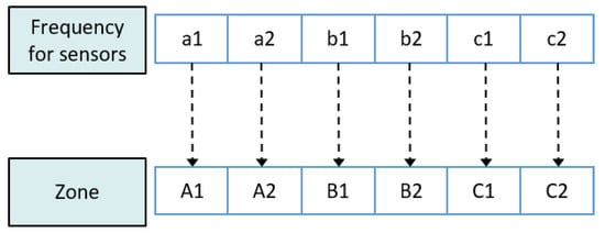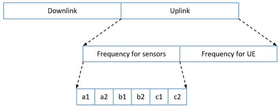 In this paper, we propose a resource allocation scheme called fractional frequency reuse 3 (FFR-3). The reason for naming the proposed scheme FFR-3 is that interference mitigation and resource reuse methods are designed by dividing each cell and radio frequency into three areas. In the semi-static scheme, some resources are fixedly allocated for particular links and some resources are reused across links. In the proposed FFR-3, fixed orthogonal resources are allocated to cellular links in the same cell to avoid mutual interference. On the other hand, to minimize throughput loss, D2D links reuse resources allocated to cellular links to the extent that interference is minimized. The detailed procedure of the proposed scheme is as follows. Figure 3 and Figure 4 show the cell structure and frequency partitioning in FFR-3, respectively. As shown in Figure 3, a cell is divided into three sectors named A, B, and C. Each sector is again divided into two zones, and each zone is identified by a number after the sector name such as and . As a result, each cell is divided into six zones consisting of , , , , and . In FFR-3, uplink resources are divided into frequencies for UEs and for sensors. The frequency for sensors is divided into six sections as shown in Figure 4. The proposed FFR-3 allocates orthogonal resources to cellular links in the same cell. As seen in Figure 5, orthogonal frequencies consisting of , , , , and are allocated to cellular links of a zone from to , exclusively. Accordingly, there is no intra-cell interference for cellular links. Moreover, the inter-cell interference is also avoided in FFR-3 by designing cell structure so that zones of the same name are not contiguous. To avoid the interference between cellular and D2D links and increase the cell throughput, the D2D links in each zone reuse the frequencies used by the cellular links in the neighboring zones. For example, as seen in Figure 6, the D2D links in zone use and frequencies that are used by cellular links in and zones, respectively. In the same way, the D2D links in zone uses frequencies and used by the cellular links in the neighboring zones. According to the cell structure of FFR-3, the D2D links of each zone allocate orthogonal resources to the D2D links of the neighboring zone. As a result, in FFR-3, each zone has one frequency section for cellular links and two frequency sections for D2D links. Note that frequency reuse factor (FRF) for the cellular link is one because one zone, which is 1/6 of the entire cell area, uses 1/6 of the entire frequency domain. FRF for the D2D link is two because one zone, which is 1/6 of the entire cell area, uses 2/6 of the entire frequency domain.