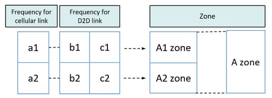 where is the number of average users in a zone s, who use the link, m. We assume that users are deployed uniformly, so the is the same for every zone. is a set of neighboring zones of the zone z. In the mode, channels are determined for each zone, and it is described in Figure 7. The number of neighboring zones which interfere with the z zone is denoted as , as shown in Table 3. The is the link that the interferer use. The is the system they use, which consists of the and the , which is the semi-static mode. Thus, it is simplified to determine zones of interfering sources by using n. Accordingly, Equation (9) is rederived as