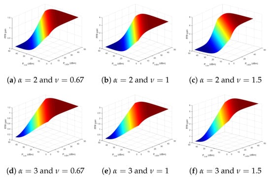 Figure 11 shows the versus and with various path loss exponents, and the ratio of the number of users for each link, . We set 20 users for a zone, and the number of users for each link is determined according to . For instance, the case means that 12 users use cellular link, and eight users use D2D link. The higher means that mode is more appropriate than the semi-static mode in the case. The graphs have a common tendency: the is increased with high uses of D2D link. The graphs show that more , the more in all cases. In addition, the is increased with higher comparatively. It implies that the more users using D2D links, the better performance of the mode. According to the design, D2D links use double frequency domains. It is the prime factor to enhance the . On the other hand, the is increased when the path loss exponent is increased. If the is high, the path loss would be increased, and the received power via longer distance is more reduced according to Equation (7). Then, the portion of cellular link in is decreased comparatively. As with the effects of as mentioned above, the more influence of the D2D link, the larger .