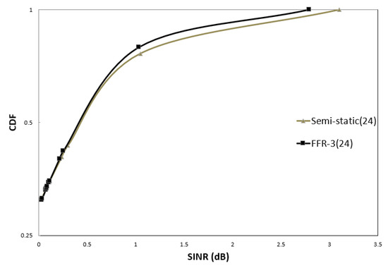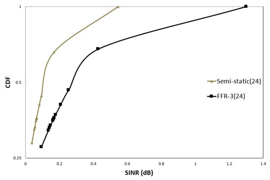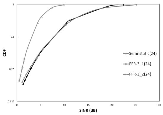 As described above, in FFR-3, two frequency sections are allocated for a D2D link in one zone. The two allocated frequencies are also symmetric in terms of geographical distribution, so they have similar SINR distributions. In Figure 16, FFR-3_1 and FFR-3_2 represent SINR distributions for the two frequency sections used by D2D links, respectively, and show similar distributions. Both frequency sections allocated for the D2D links in FFR-3 show superior SINR over the semi-static scheme.