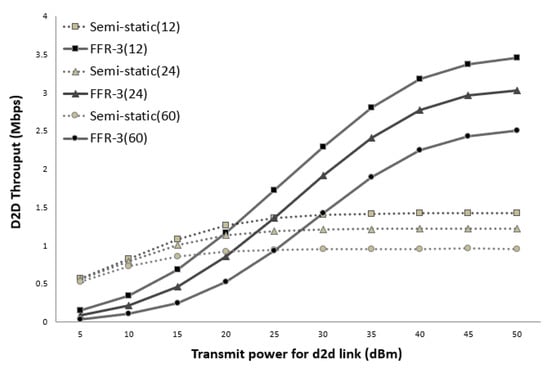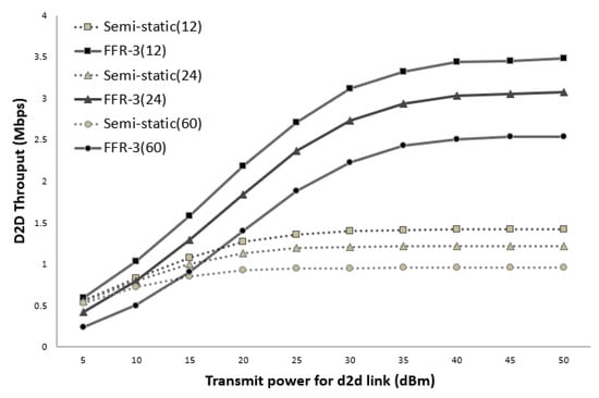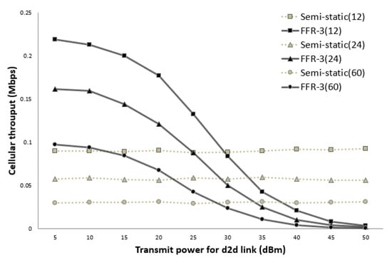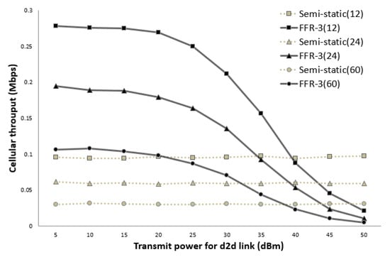 Figure 14 and Figure 15 show the average throughput of the cellular links according to the transmission (Tx) power of the D2D links when the cellular link Tx power is 30 dBm and 40 dBm, respectively. In the legend used in Figure 14 and Figure 15, the numbers in parentheses indicate the number of sensors per cell. In the semi-static scheme, the cellular link is affected by other cellular links in neighboring cells. Thus, the average throughput of the cellular links is constant even if the Tx power of the D2D links changes. On the other hand, the throughput of the cellular links in FFR-3 is affected by the Tx power of D2D links in neighboring cell. As shown in Figure 14 and Figure 15, when the transmission power of the D2D link is less than the transmission power of the cellular link, the throughput of the proposed algorithm is superior to that of the semi-static scheme. In the sensor deployed system, the D2D link is designed for short-range communication between sensors, and the cellular link is designed for communication between the sensor and the base station. Therefore, the transmission power of the D2D link is generally much less than the transmission power of the cellular link. This means that a spot in a real field would be on the left side of the graphs in Figure 14 and Figure 15. Thus, FFR-3 would be much better than semi-static in terms of the average throughput of the cellular links.