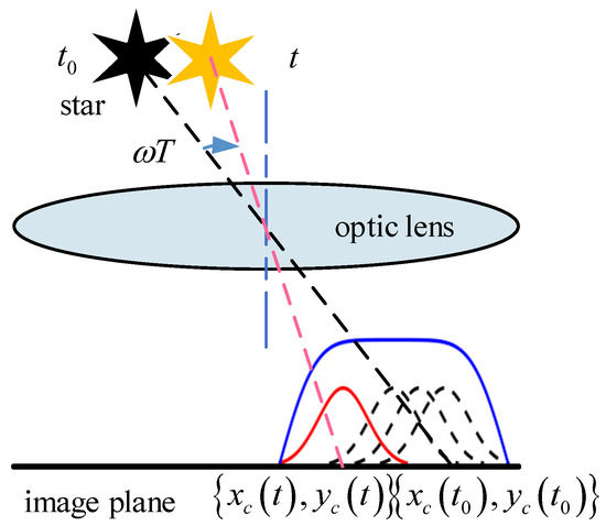 where can be calculated with the star position in the image plane coordinates. Suppose that during the period of , the angular velocity is constant. For the ith star in the image plane, its trajectory can be calculated by the following: