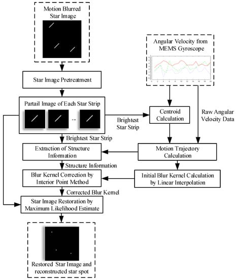 As mentioned above, a blur kernel is necessary to restore the blurred star image. The blur kernel is concerned with motion trajectory. As a star strip is mainly caused by the rotation of the star sensor, a MEMS gyroscope can be used as an assistant device to obtain the blur kernel at any angular velocity. In ideal conditions, the blur kernel can be deduced from the precious angular velocity. As the bias and installation deviation of the gyroscope can affect the accuracy of the blur kernel, a correction process is need. The strip in the star image is the intuitionistic behavior of motion blur, the structure information of the star strip is used to correct the blur kernel from the gyroscope in this paper. Afterwards, a fast star spot reconstruction is carried out with the corrected blur kernel. The flow chart is shown in Figure 3.