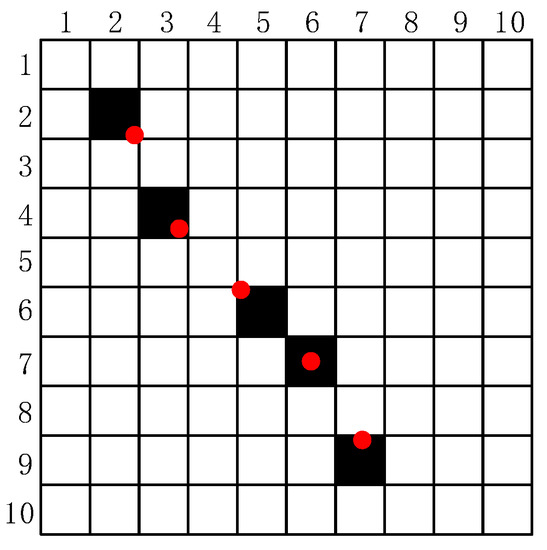 Suppose there are n trajectory points after exposure. The coordinates of each trajectory point are not integers, so a rounding operation is done and expresses them in a matrix. As shown in Figure 4, the red dots are the actual position of the trajectory points, the black squares are their position by rounding operation, and the white squares are zeros elements. As the trajectory points in the matrix are disconnected, and the value of non-zero elements in the matrix are unknown, a post-process is needed.