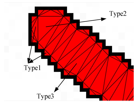 To obtain the skeleton of a star strip quickly, a meshing method is adopted. As triangles have a great deal of flexibility in the representation of geometric shapes, they are chosen as the element of the mesh. Delaunay triangulation is the most well-developed and effective method in all two-dimensional planar triangulation methods. It has the advantage of simplicity for implementation, little memory expense, and it can adapt to a variety of irregular shapes. Therefore, it is suitable for the skeletonization of a star strip. The detail of the Delaunay triangulation can be found in the literature [31]. For the triangle mesh of star strip, there are three types of triangle after triangulation, as shown in Figure 5.