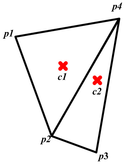 The skeleton is formed by the local symmetry points of the local area [32]. Thus, to each triangle, a point that reflects the local symmetry should be selected as the skeleton. As shown in Figure 6, the end triangle is similar to the equilateral triangle, so its circumcenter, c1, is the skeleton point, as follows: