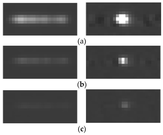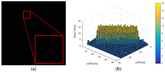 Figure 22 shows the brightness comparison before and after restoration. In the left column of Figure 22, the star strips are dim before the restoration. Some of the star strips are broken into several pieces and submerged in the background, which cannot be detected. In the right column of Figure 22, the dim pieces of the strip get together after restoration, so the brightness of the star after restoration is enhanced, which becomes easier to detect. The average value of the background pixels is 61. In Figure 22a, the maximum value of the pixel on the stripe is 177, and this value becomes 255 after restoration, and many pixels are saturation. In Figure 22b, the maximum value of pixel on the stripe is 91, and this value become 255 after restoration. In Figure 22c, the maximum value of the pixel on the stripe is 67, and this value become 97 after restoration.