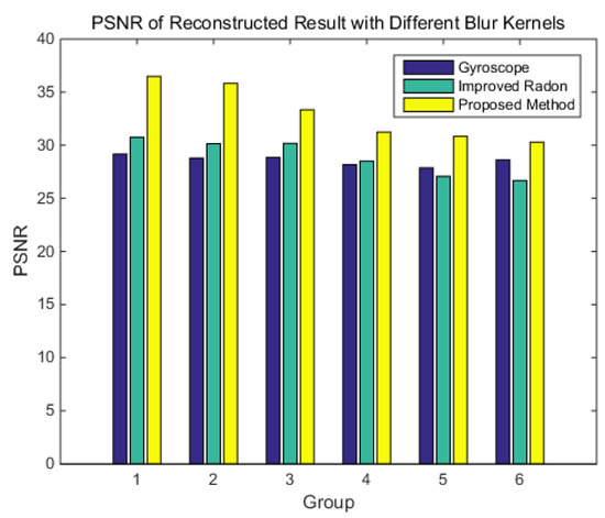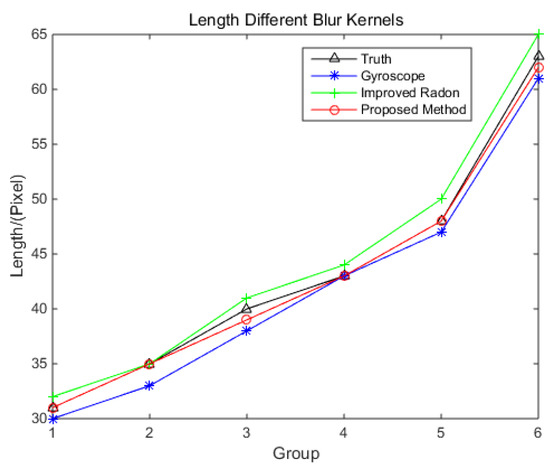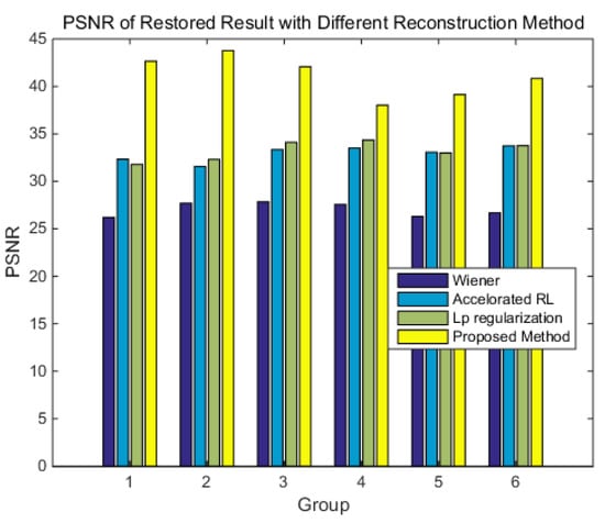 The methods involved in the comparison are the Wiener filter [25], accelerated RL [19] method, and -regularization [24], and the parameters of the comparison methods are set according to [19,24,25]. All of the reconstruction methods above are carried out with the corrected blur kernel as the uniform condition.
