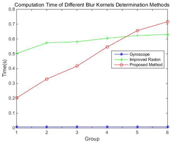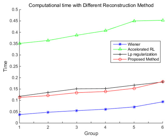 The computation time of each method at the angular velocities in Table 2 is shown in Figure 19. The result shows that the Wiener filter is the fastest, and the accelerated RL method is the slowest. The proposed method is slightly faster than -regularization, and offers a speedup of nearly three times more than the accelerated RL method. As the length of the star strip increases with the increase of the angular velocity, the size of the partial image to be reconstructed is larger, which makes the computation time increase, and this can be also found in Figure 18.
