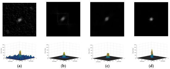 As the Wiener filter can amplify noise, the noise is enhanced in Figure 16a. Figure 16b is the result of accelerated RL method, and the image is reconstructed gradually with the increase in the number of iterations. However, the ringing phenomenon around the spot is more obvious. Figure 16c shows the result of -regularization, and it is a maximum posteriori probability method that utilizes the prior information of the energy distribution of the star. -regularization has good robustness to noise, but the overall brightness of the reconstructed star spot is low. The energy concentration of the reconstructed star spot using the -regularization method is better than that using the accelerated RL method and the Wiener filter. Figure 16d shows the result of the proposed method. The energy concentration and the overall brightness of the reconstructed star spot by using the proposed method are better than the other three methods, and the proposed method is robust to noise.