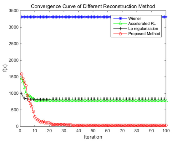 For the computation speed, the convergence rate and the total computation time are chosen as the evaluation indicators. The convergence curve of each method is shown in Figure 18, where the horizontal axis is the number of iterations. The vertical axis is the value of function f(x); the function represents the similarity between the reconstruction result after blur processing and observed blur image. It is defined as follows: