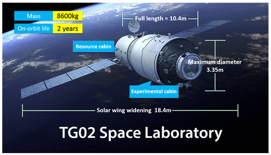Tiangong-2 (TG02) developed by China serves as a truly useful and important spacelab follow-on to Tiangong-1 (TG01). It was launched into near-polar orbits with an initial altitude of about 393 km [1] at the Jiuquan Satellite Launch Centre (JSLC) on 15 September 2016. Its scientific targets are not only to further validate the Rendezvous and Docking (RVD) technology, but also to take on the scientific research and application experiments in the fields of Earth observation from space, space science and technology and aerospace medicine, such as the release of a companion satellite or a cargo spacecraft and its docking. TG02 is similar to TG01 launched in 2011, both are characterized by low orbit and large volume, and all have an experiment cabin, as well as a resource cabin. The main parameters of TG02 are the designed life of two years, the orbital period of 92.2 min, the orbital inclination of 42.8, the mass of 8600 kg, the full length of 10.4 m, the maximum diameter of 3.35 m and the solar wing widening of about 18.4 m; see Figure 1. TG02 is mounted with a dual-frequency geodetic GNSS receiver, Laser Retroreflector Array (LRA), a Laser Lidar Retroreflector Array (LRRA), a cold atomic clock, a spectrograph, a microwave altimeter and other scientific instruments [2].