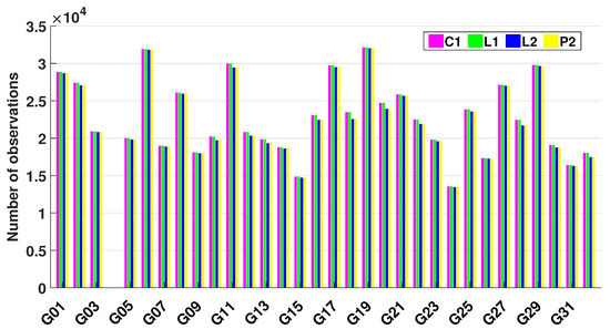 Figure 2 shows the number of GNSS code and phase measurements on Day Of Year (DOY) 339, 2016. It can be seen that the number of these four types of observations (C1/P2/L1/L2) is almost the same.