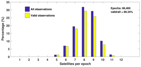 Relationship between the number of observed satellites and the ratio of epochs observed at a certain number of satellites to total epochs for DOY 339, 2016. The blue bar represents the “All observations”, and the yellow bar represents the “Valid observations”.