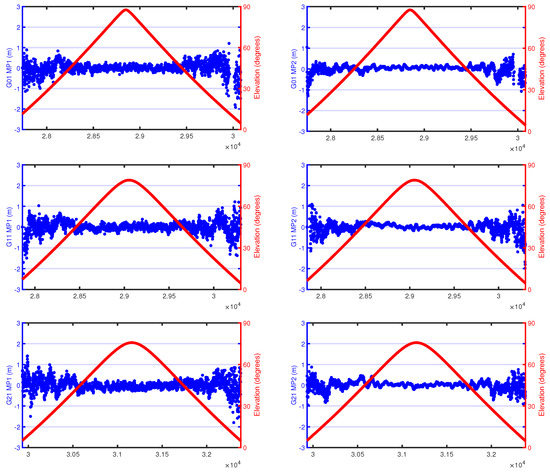 The Multipath Combinations (MPCs) are constructed based on the algorithms used in TEQC [9] using single-frequency code measurements and dual-frequency phase measurements of a continuous ambiguity arc. Constant biases, such as the ambiguities and hardware delay in the satellite and the receiver, are removed by averaging the MPCs of an ambiguity arc. Figure 4 shows an example of MPC time series of C1 and P2 observations and elevation-angle variations of complete passes for three different GNSS satellites with maximum elevation angles close to 90 for DOY 339, 2016. The blue dots represent the MP values, and the dark red lines denote the elevation time series. Due to the rapid movement of TG02, the ascending and descending phases of GNSS satellites are very rapid, and the time interval of a complete satellite pass is only approximately 40 min, which is much smaller than that of ground stations. As illustrated in Figure 4, the lower the elevation angle, the greater the multipath error. Compared with that of C1, MPCs of P2 are smaller for all elevations. The MPCs of C1 and P2 are rather stable, and no gaps are observed at a high elevation.