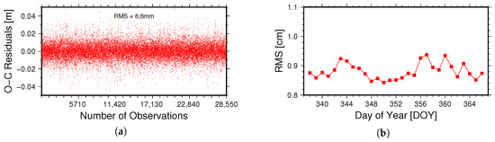 For POD calculations, most observation errors are corrected during the observation linearization step before normal equation stacking, while the un- or mis-modeled errors, such as observation noise, are still left in the observation equation. From a statistical perspective, part of these errors will be absorbed into the parameters through the estimator, while the rest will still be present in the residuals [8]. However, if we have a good quality of observation data, precise force models and proper parameter estimation, the fitting residuals will be close to the observation noise [3,21]. Usually, large residuals reveal poor POD estimation. However, small residuals can still be obtained even if some errors are not very well modeled, since they can be absorbed into the parameters during the adjustment process. Therefore, residual analysis only can indicate the internal consistency of POD results, but not an external validation. The Figure 5a illustrates the distribution of phase residuals on 3 December 2016, in which the horizontal axis represents the number of observations and the vertical axis represents the phase fitting residuals (in meters). The Figure 5b illustrates the daily RMS of onboard GNSS phase residuals from 3–31 December 2016 (a total of 29 days).